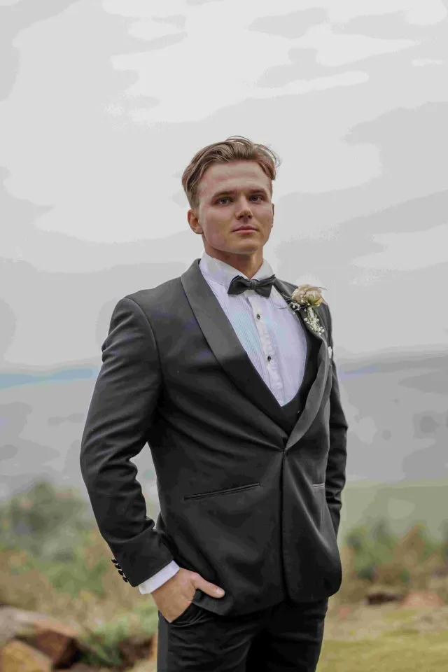 Trent chose a black tuxedo with a waistcoat and a black bow tie. Very smart, fitted and classy.